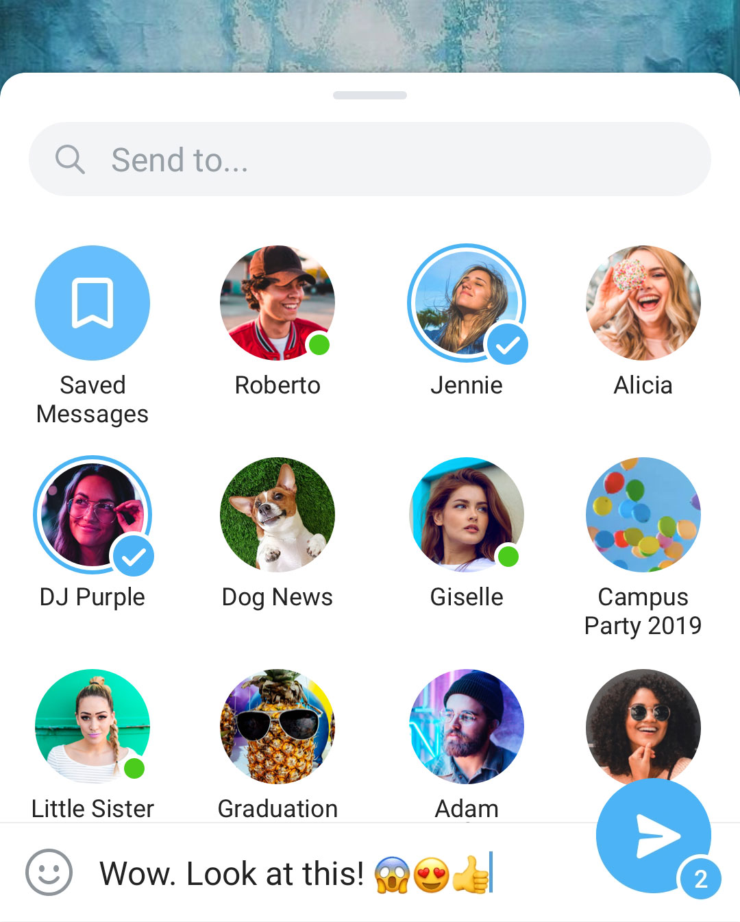 The new sharing menu with online badges and emoji support