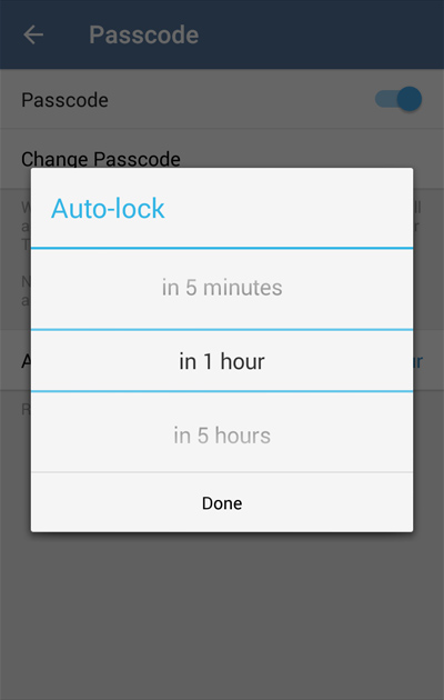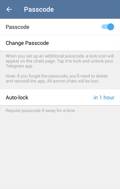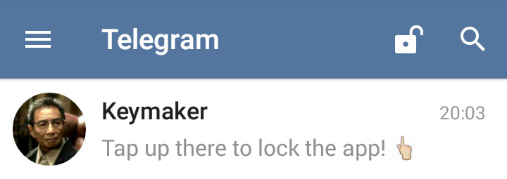 Since unlocking Telegram each time can get annoying, we implemented both manual and auto-lock. You can lock the app manually from the chats screen or enable auto-lock after a specified period of inactivity. iOS users can use Touch ID to unlock the app.