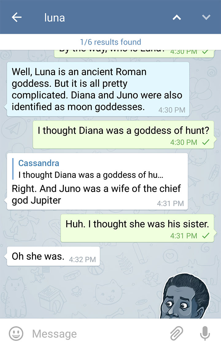 All of your communications in Telegram are already instantly searchable with the multi-purpose search field, but now you can also search for messages in specific chats. Just tap on the name of the chat in iOS or toggle the Actions menu in Android: