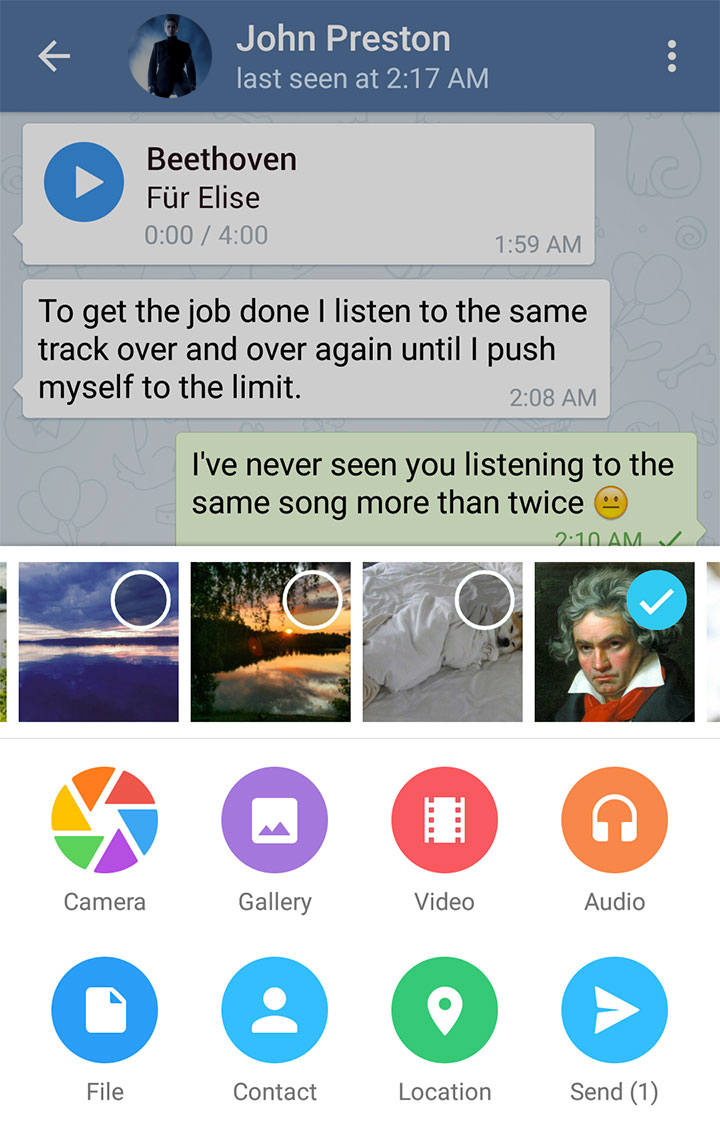 The new attachment menu in Android is not only gorgeous and beautifully animated; it also allows you to share contacts, audios and recent photos way easier: