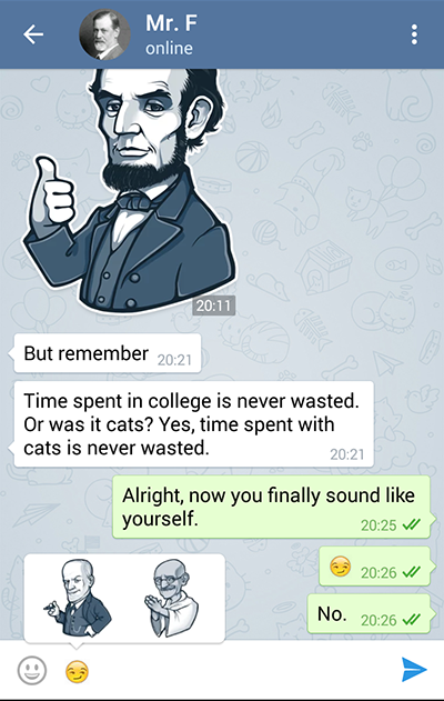 Telegram stickers are grouped around emotions, not characters. They do not clutter the interface, but are shown only when they are relevant – you will see a list of emotionally corresponding stickers whenever you start a message with an emoji. All our stickers are and will be completely free, and you can always create and share your own stickers.