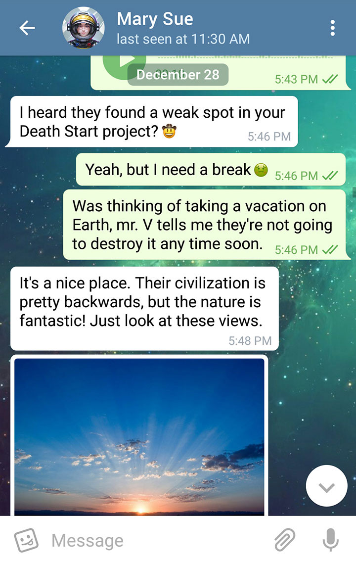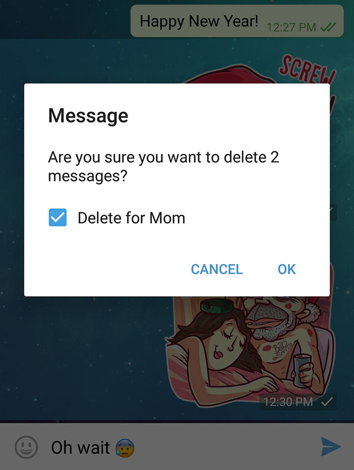 Happy new 2017! We hope everybody had a great celebration. We at Telegram certainly did. One of our engineers got so excited about the new year that he mistakenly shared these stickers with his Mom: